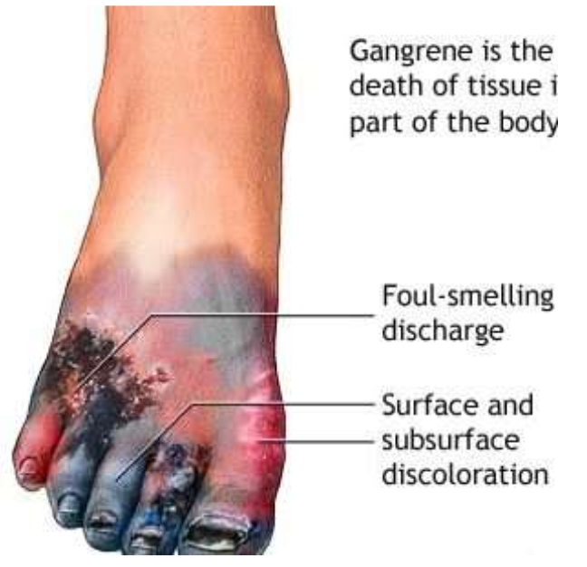 • Infection. If bacteria thrive unchecked for long, infection can take over and cause your tissue to die, causing gangrene.